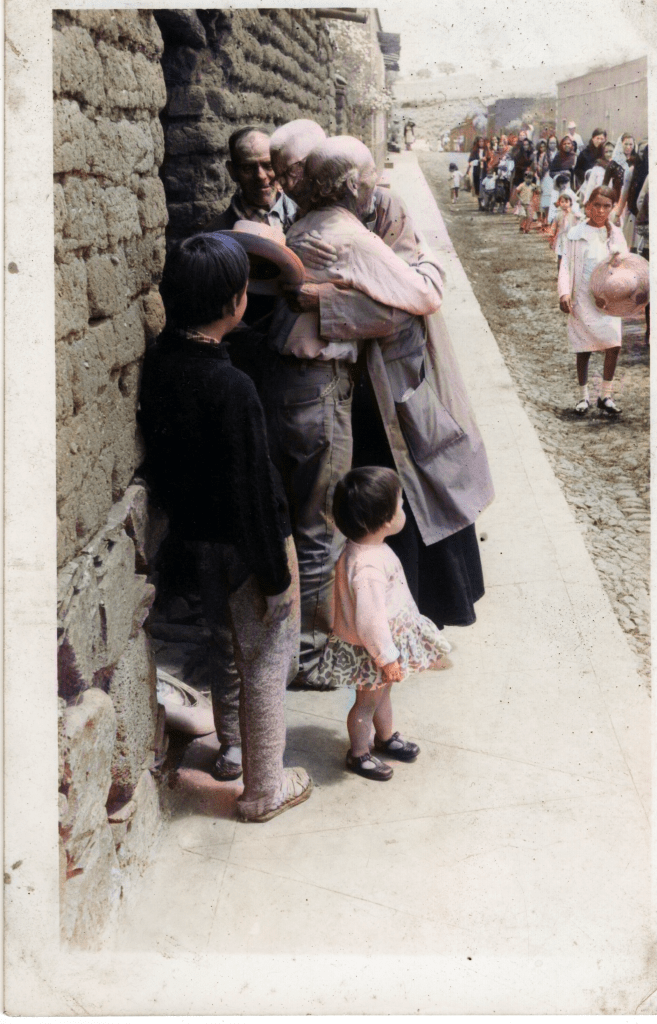 En la fotografía podemos un abrazo entre un feligrés y un sacerdote. A simple vista no ubico la calle, pero por el fondo pudiera ser la salida al río de abajo.