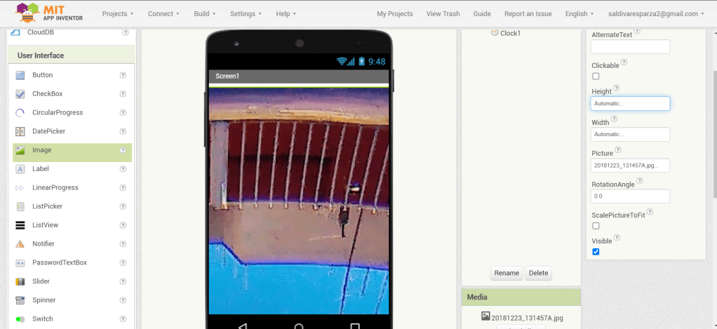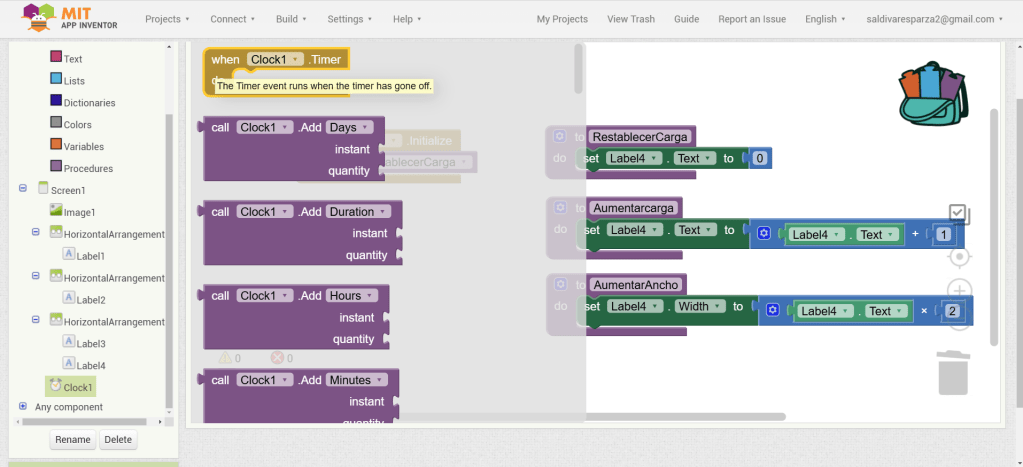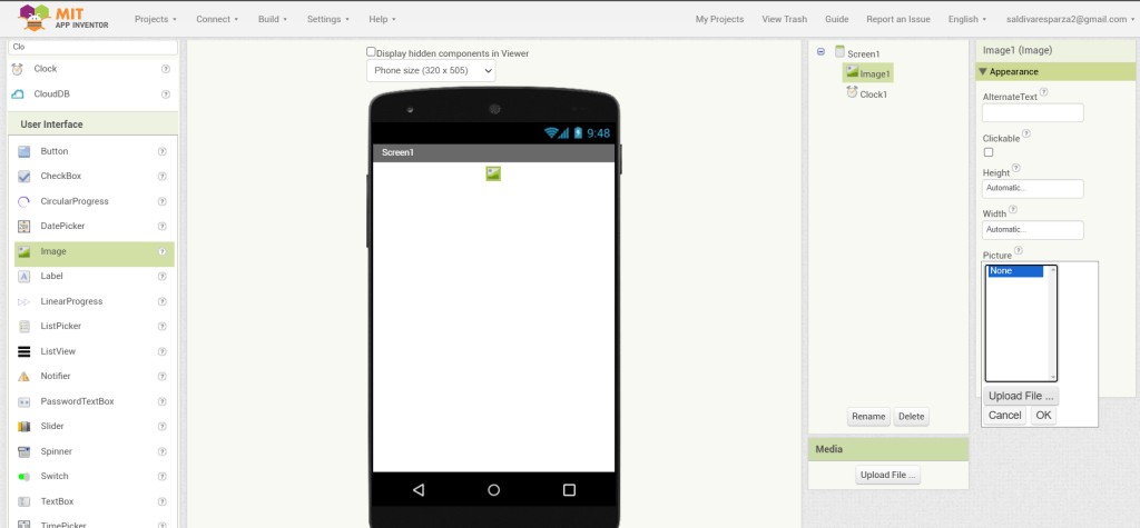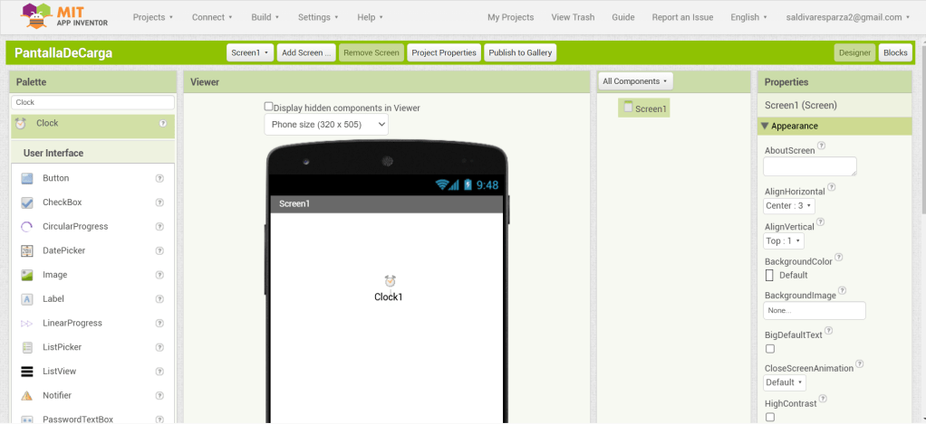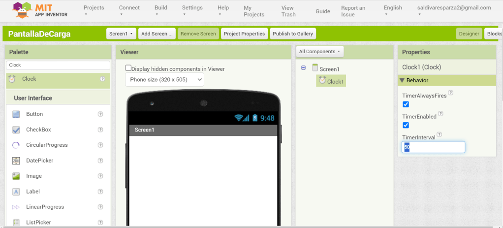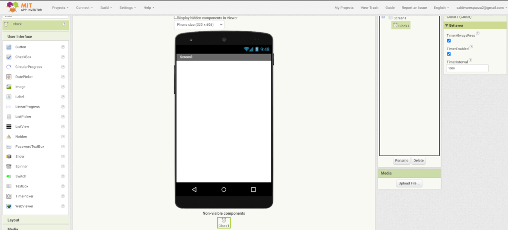 4. Agregamos el elmento reloj a nuestra pantalla. Al tratarse de un elemento invisible, se colocará abajo de la pantalla.