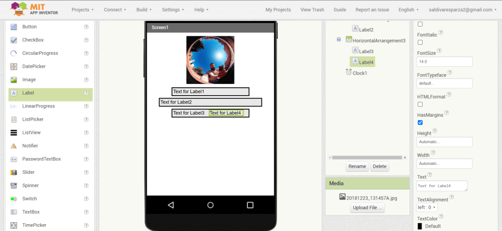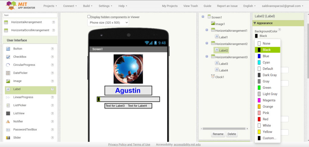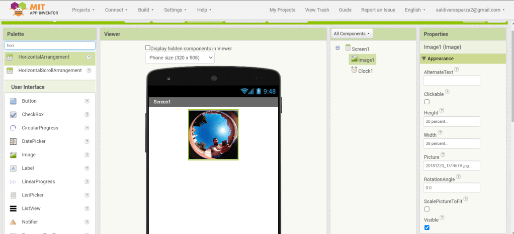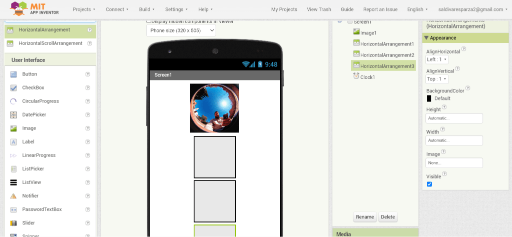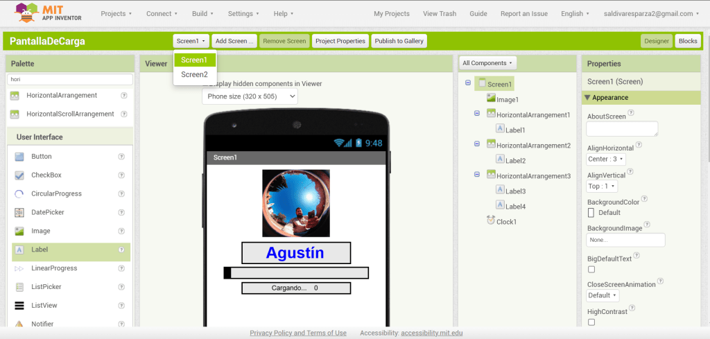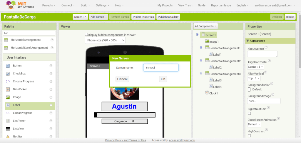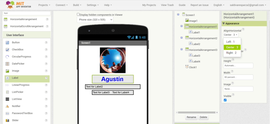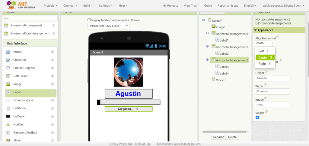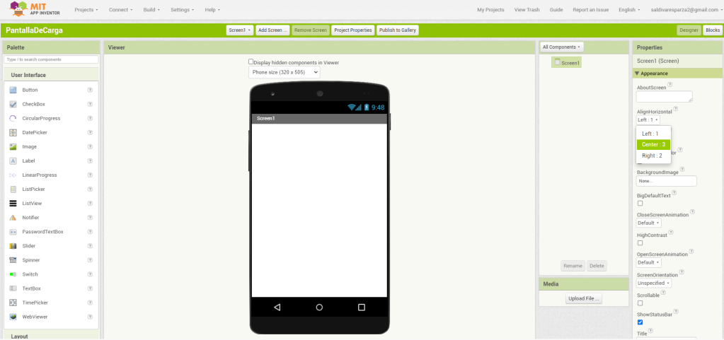3. En las propiedades de Screen1, seleccionaré ‘Centro’ para la alineación horizontal.