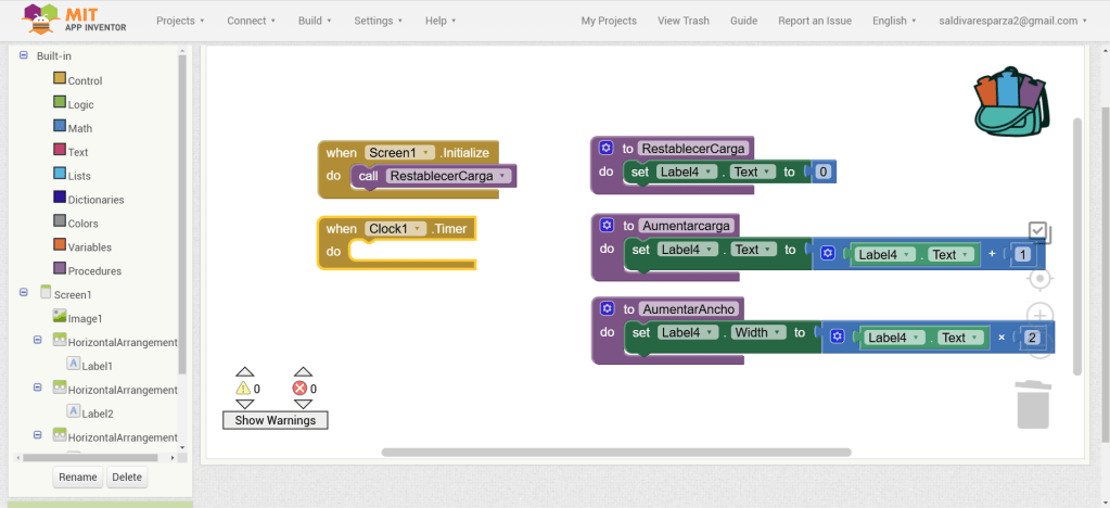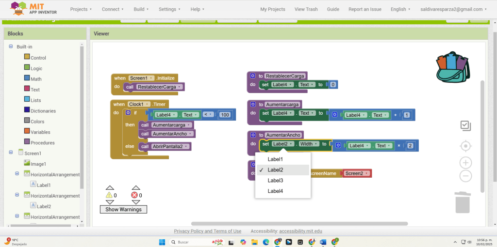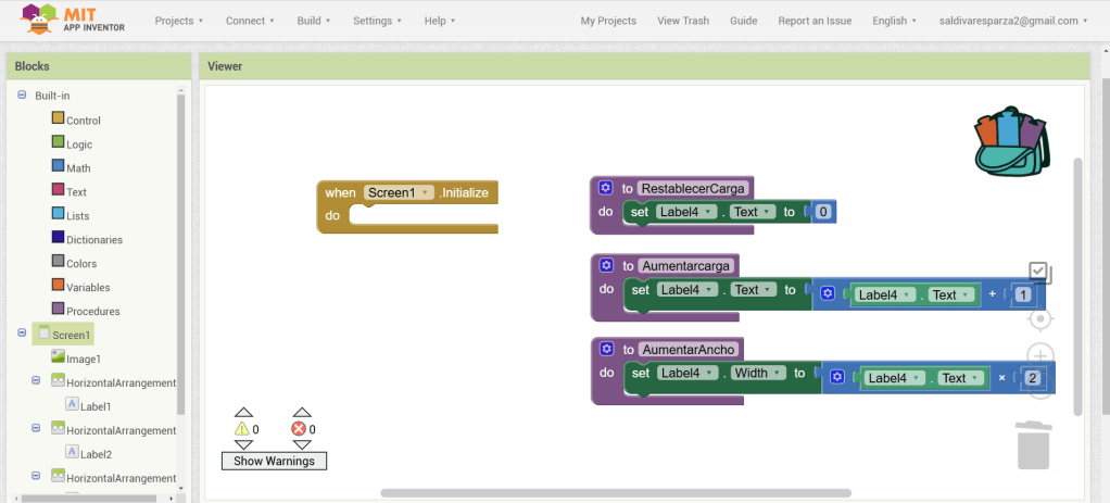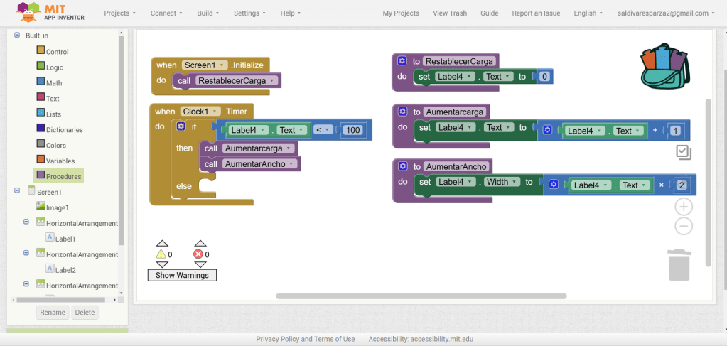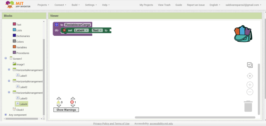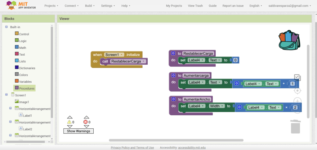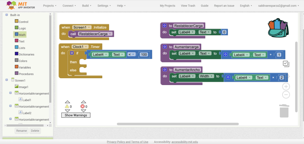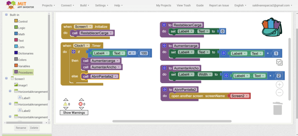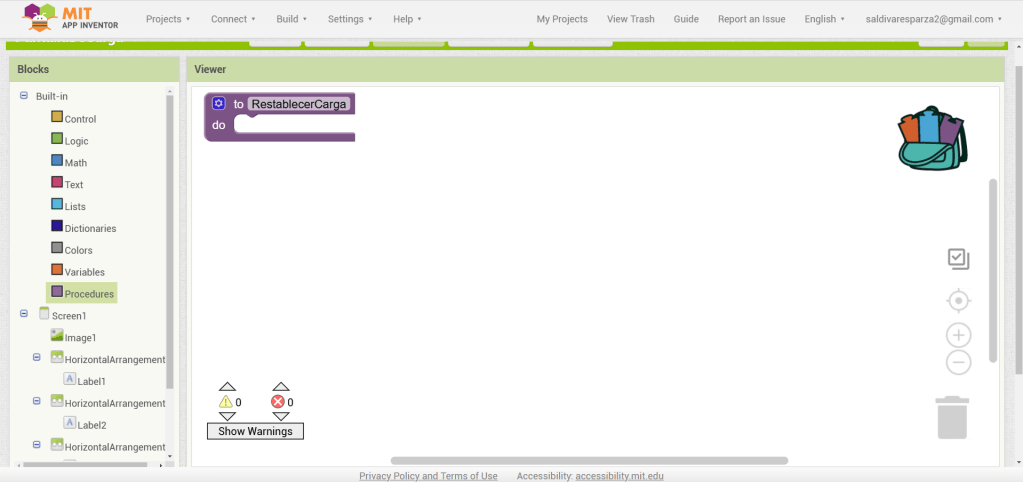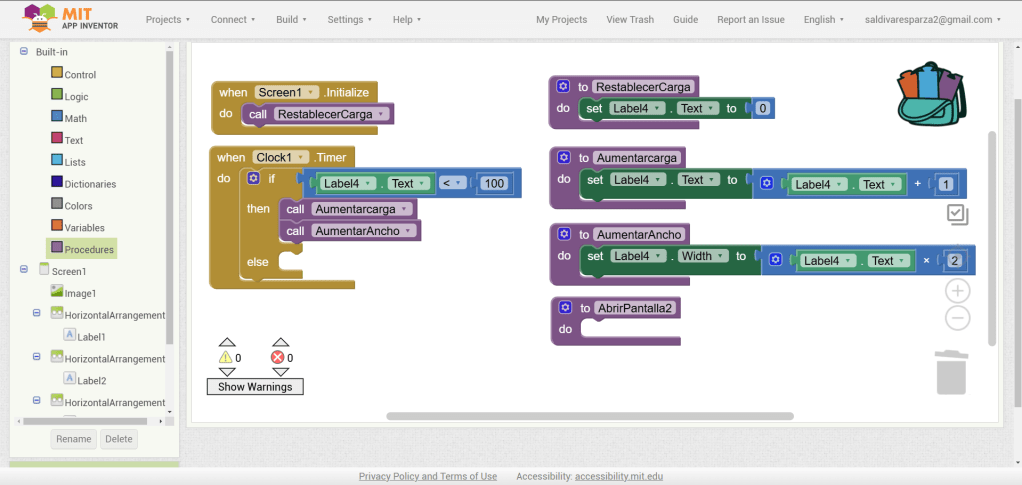 31. Hacemos clic ahora en Screen1 y seleccionamos el evento que nos permite cargar procedimientos cuando la pantalla inicia. Ensambalamos el procedimiento de RestablecerCarga.