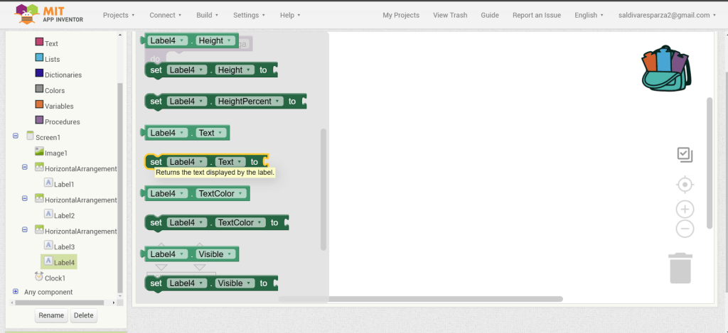 23. Hacemos clic en la segunda etiqueta del tercer arreglo y seleccionamos la propiedad de texto y lo ensamblamos en el bloque anterior.