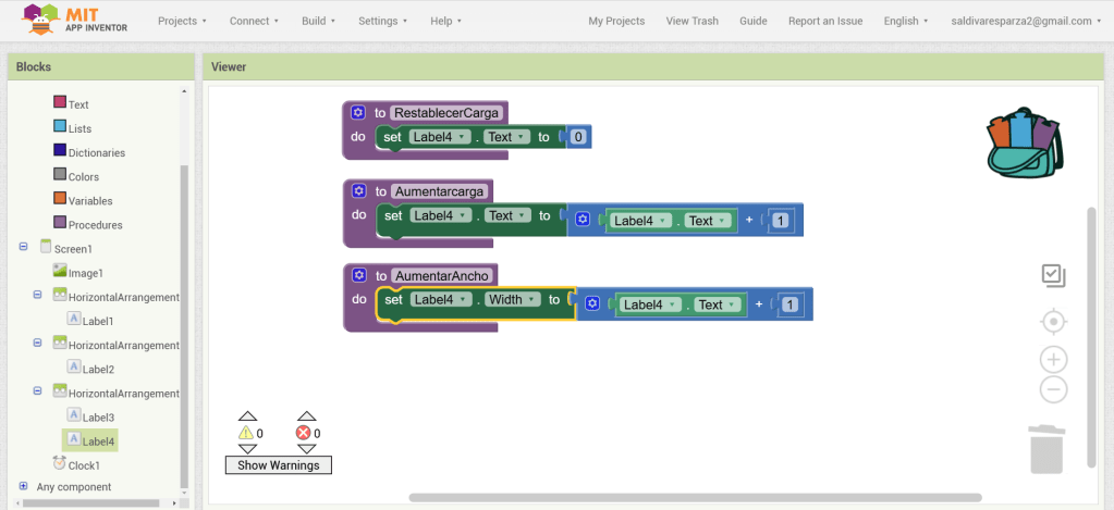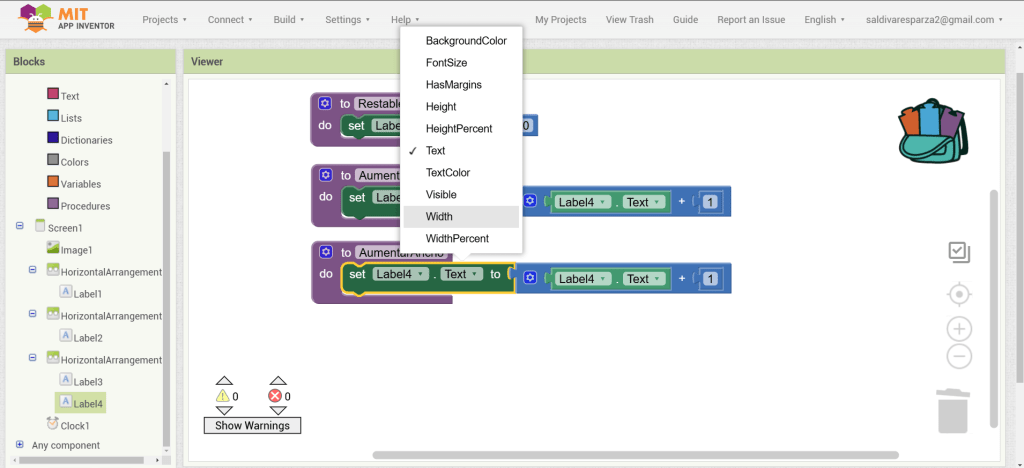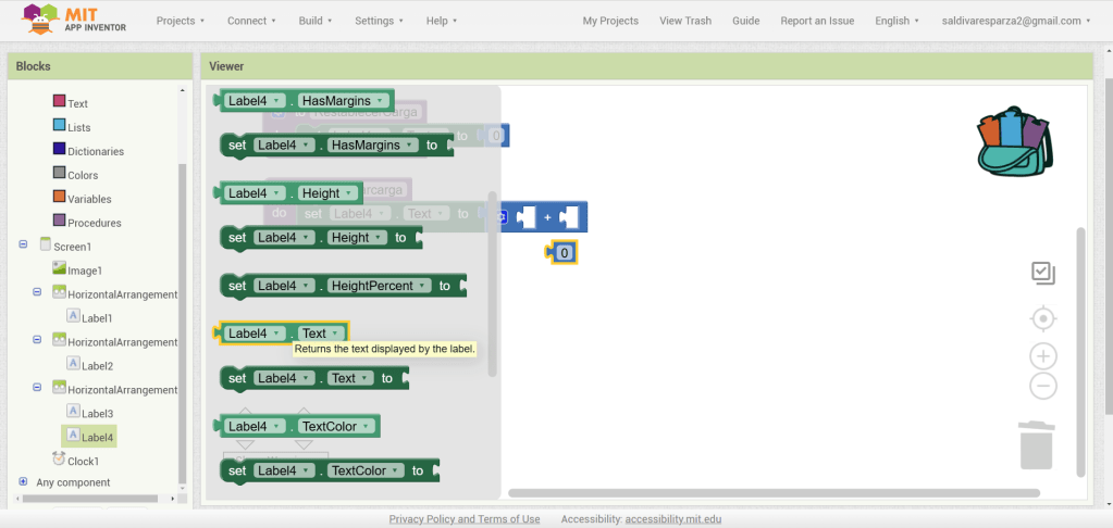 26. Hacemos de nuevo clic en la segunda etiqueta del tercer arreglo y ahora seleccionamos el bloque que nos da el texto de la etiqueta y lo incertamos en la primera entrada de la suma.