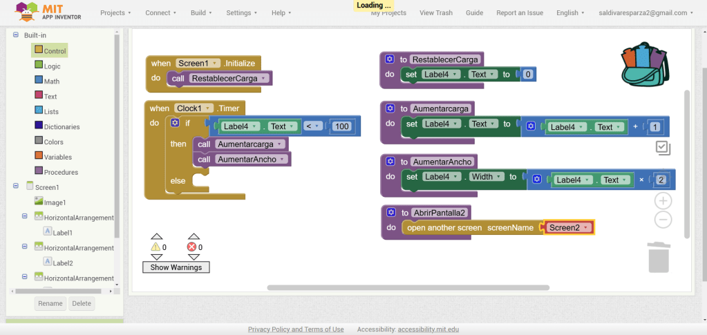 34. Ahora nos falta agregar las acciones que ocurrirán cuando no se cumpla la condición. Es decir, cuando la carga se complete. Para ello vamos a crear un procedimiento llamada AbrirPantalla2. vamos a ir los bloques de control y vamos a seleccionar el bloque que nos permite abrir otra pantalla. Lo vamos a ensamblar y vamos a seleccionar Screen2. Finalmente vamos a insertar ese procemiento en else de nuestro bloque anterior.