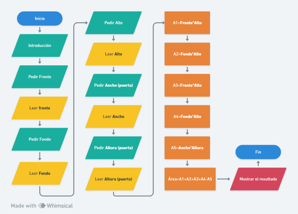 El área total será entonces, la suma de las cuatro paredes y le vamos a restar el área de la puerta, por lo que la máquina deberá preguntar al humano los datos (entradas), realizará el proceso y dará el resultado en la salida. Entonces la conversación humano máquina será la que se muestra en el pseudocódigo.