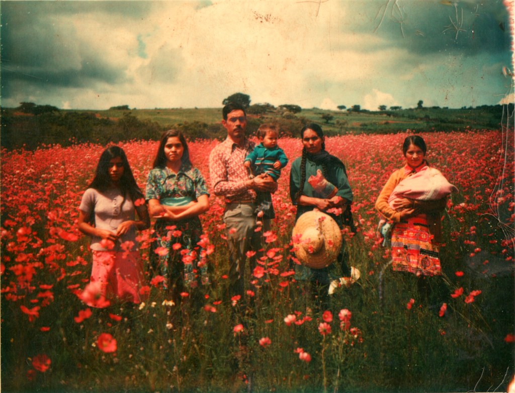 En la imagen podemos ver a J. Guadalupe Saldívar, Maximina Ibarra, Antonia Durán, Alicia Saldívar, Teresa Saldívar y Antonio Saldívar posando en la orilla de un gran banco de mirasoles.